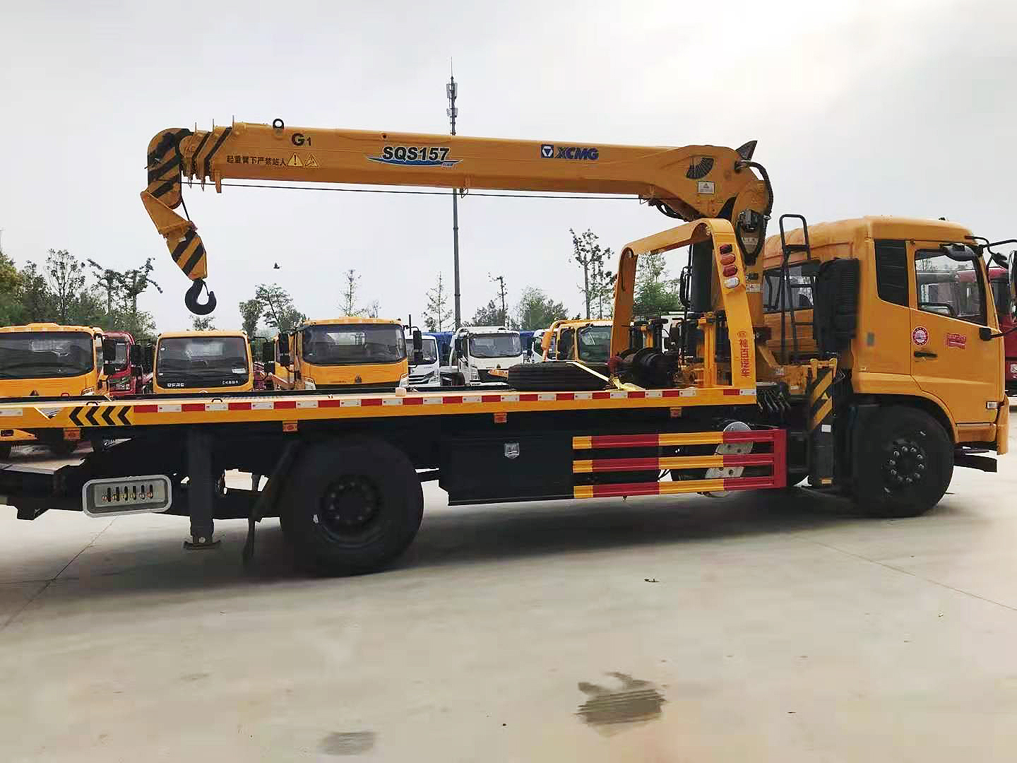 專用功能配置:上裝采用 6mm 高強度花紋板制作,(防滑能力強,承載能力高,外表美觀),該車平板總長度為 6.5米(含尾部板長 1.1 米),寬 2.55 米,平板承載質量為 10噸。采用嘉善取力器,長源泵、意大利海德閥 加兩個平衡閥,液壓油管采用耐壓雙層鋼絲油管,抗壓力達到 18 兆帕,1 個工具箱,配兩個小車(**輪),4 根捆綁帶,L 型抱胎架一對,托叉一對,托叉座一對,鏈鉤一條,后工作燈 2 只,1 個 10噸液壓絞盤(30米鋼絲繩), 10噸三節臂后拖舉.