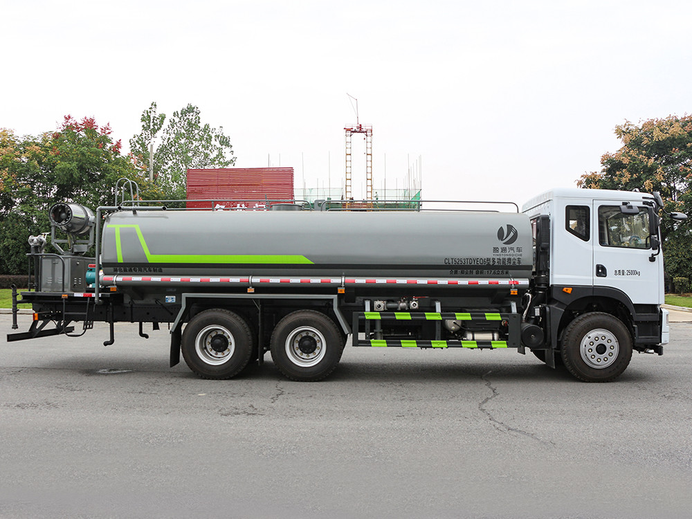 東風華神T5 -20方抑塵車-大型霧炮車產品主要技術參數 序號 名稱 型號、規格 1 整車型號 CLT5253TDYEQ6 型多功能抑塵車 2 發動機型號 B6.2NS6B260 3 發動機馬力/功率 康明斯 260 馬力/191KW 4 發動機排量 6200ML 5 變速箱 法士特 8 檔(帶高低檔) 6 輪胎規格 11.00 鋼絲胎 7 軸距 4350+1350 8 總質量 25000KG 9 整備質量 11400KG 10 額定載質量 13405KG 11 整車尺寸(長×寬×高) 10.45*2.51*3.2 12 罐體容積 20 方 13 燃料種類 柴油 14 排放標準 國六 15 水泵型號 60/90 16 罐體材質 Q235 碳鋼